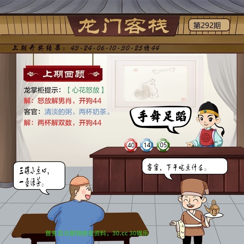第288期掌柜:歡天喜地 解:形容非常高兴的状态。 小二:客官,今天几位啊。 解:无。 客官:三位,等下就过来。 解:三位解单数的生肖兔、牛、猪、鸡、羊、蛇。 推荐九肖:虎猴猪龙鸡鼠兔羊狗 推荐六肖:虎猴猪龙鸡鼠 |